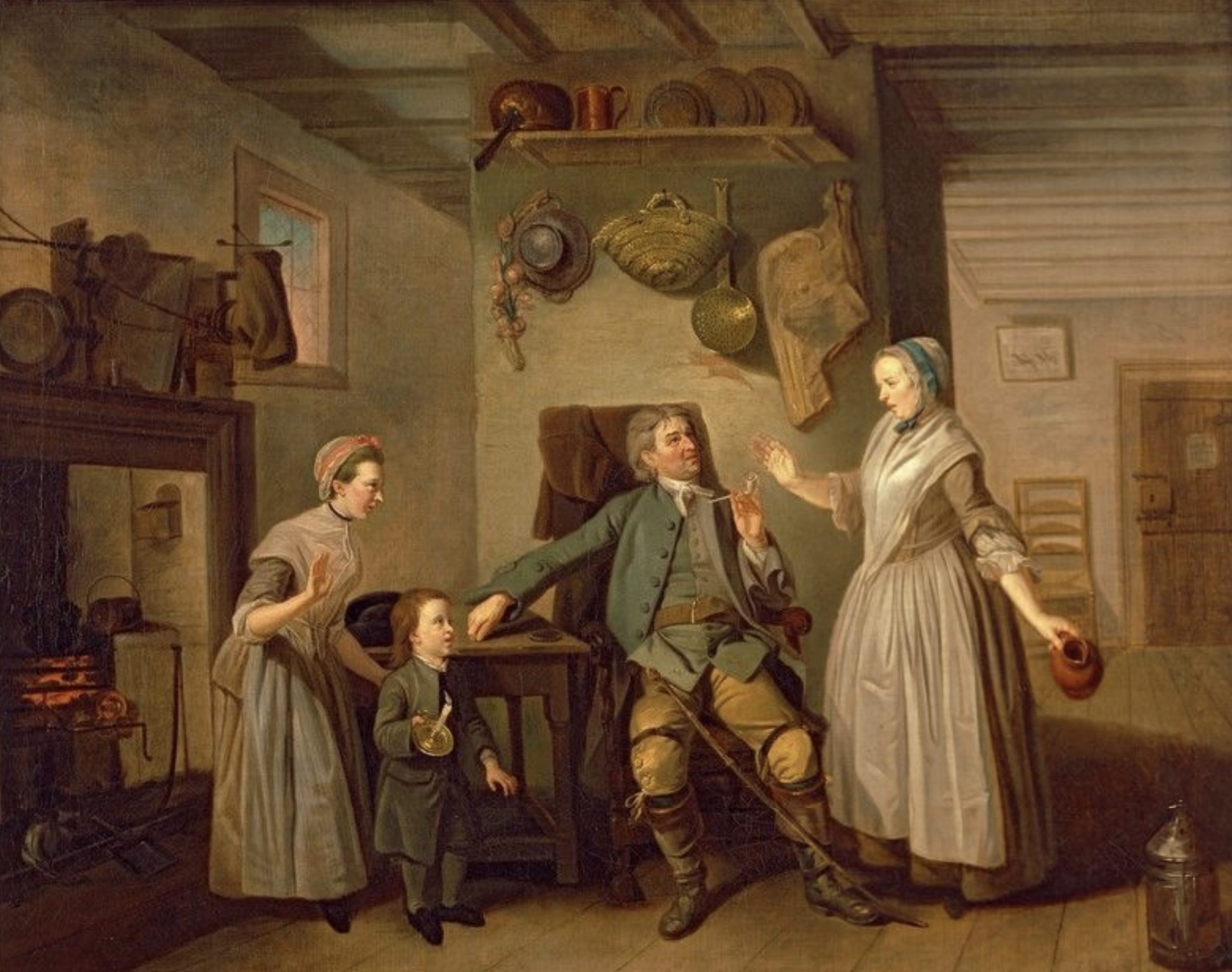 Garrick’s commissioned Zoffany to paint the comic moment in The Farmer’s Return when the farmer tells his family he encountered a London ghost famed for answering questions by knocking — once for yes and two for no — and that it knocked twice when he asked whether his wife had been faithful to him. But, he added, the ghost was “was much giv’n to Loying.” Johan Zoffany, David Garrick and Mary Bradshaw in David Garrick’s ‘The Farmer’s Return,’ ca. 1762. Paul Mellon Collection, Yale Center for British Art