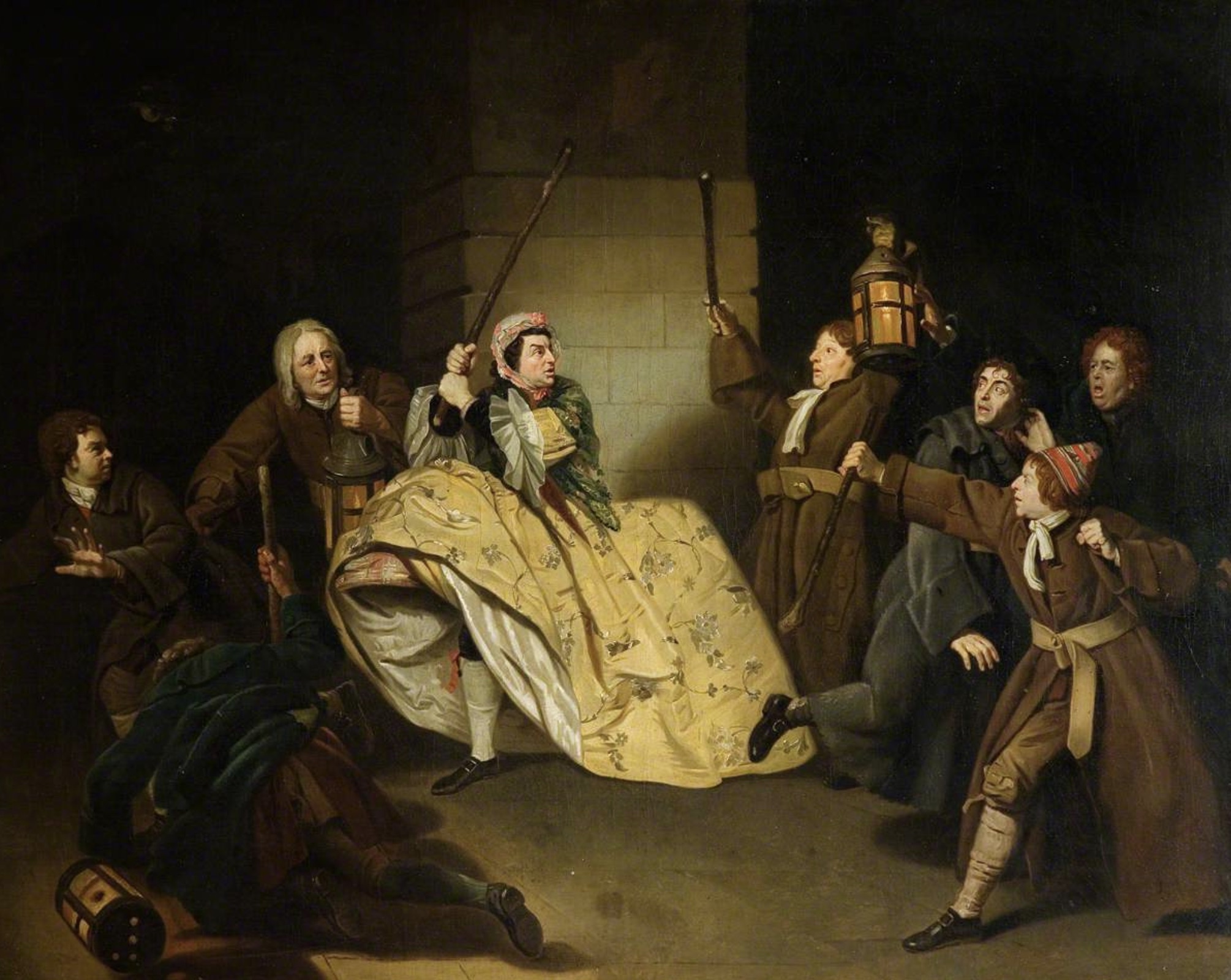 Zoffany’s theatrical paintings, many of them commissioned by David Garrick, established his reputation in the mid-1760s. Above is Parsons, Bransby, and Watkyns in a Scene from ‘Lethe,’ painted in 1766, depicting a scene from Garrick’s first play, a burlesque upon characters of Henry Fielding. Birmingham Museum Trust/Birmingham Museum & Art Gallery. Below is David Garrick as Sir John Brute in Vanbrugh’s ‘The Provok’d Wife,’ painted between 1763 and 1765, It portrays Garrick as Sir John Brute — one of his favorite roles — disguised in a woman’s clothes and being accosted by night watchmen while on drunken spree with his friends. Claiming to be “Boudoucca, Queen of the Welchmen” he threatens to destroy their legions with “a leek as long as my pedigree.” Wolverhampton Art Gallery