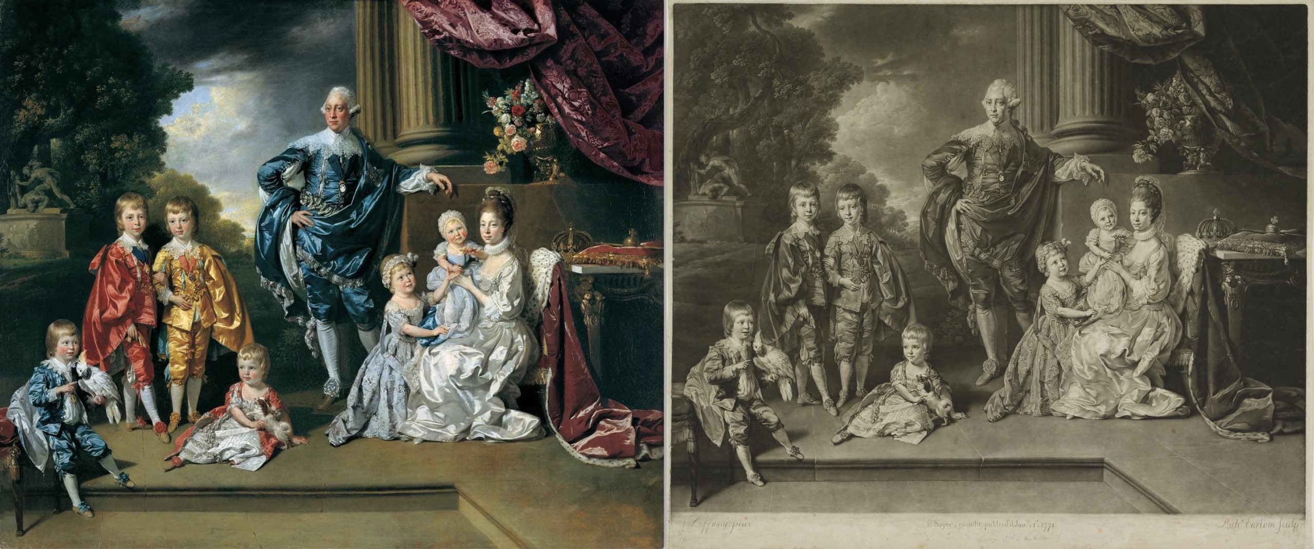 Johan Zoffany, George III, Queen Charlotte, and the Six Eldest Children, 1770. Royal Collections Trust. Their most Sacred Majesties George IIId and Queen Charlotte with his Royal Highness George Prince of Wales, Frederick Bishop of Osnaburg, Prince William Henry, Princess Charlotte August Mattilda, Prince Edward, and Princess Sophia, mezzotint by Richard Earlom after Zoffany, London, Robert Sayer, 1771.