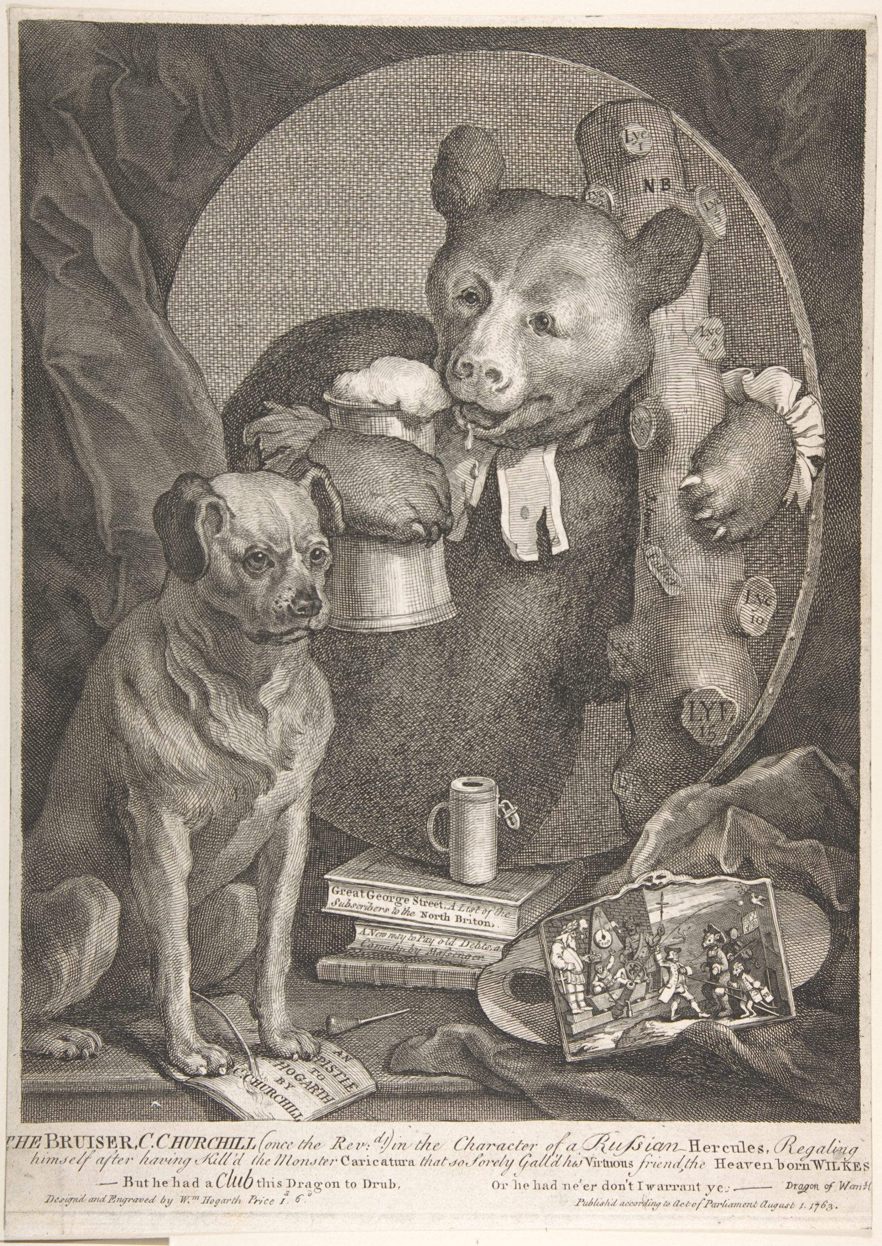 The Bruiser, C. Churchill (once the Revd) in the Character of a Russian Hercules, Regaling Himself after having Kill’d the Monster Caricatura that so Sorely Gall’d his Virtuous friend, the Heaven born Wilkes, William Hogarth, August 1, 1763, Metropolitan Museum of Art