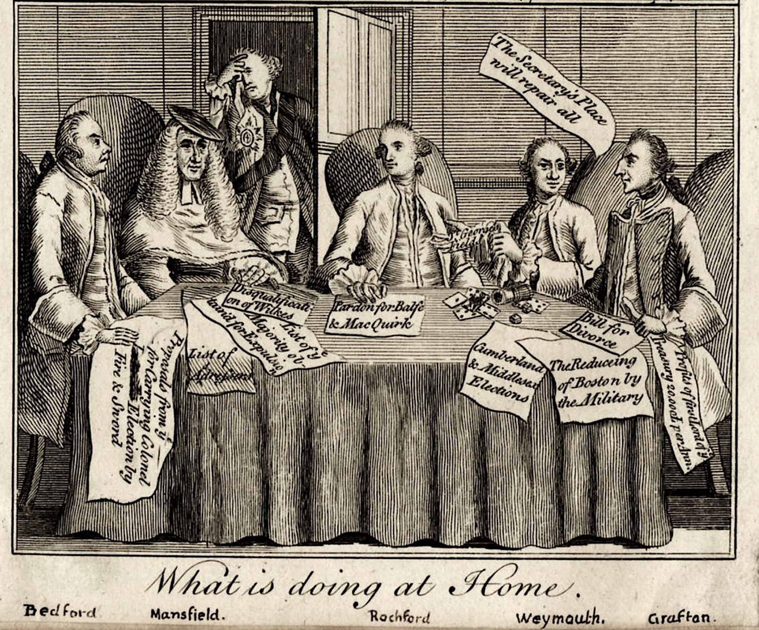 In 1769 the ministry’s obsession with Wilkes excited criticism and ridicule. In this cartoon from the Political Register, King George listens while his minister discuss public affairs. Grafton, the prime minister, at right, is concerned with his divorce, lining his pockets, and suppressing popular unrest in Boston through military occupation. To his right, Weymouth, secretary of state for the northern department (and reputedly a degenerate gambler and womanizer) is focused on the use of force to suppress protests in favor of Wilkes. The blood spilled in the St. George’s Field Massacre of 1768 is still on his hands. At center, Rochford wants to secure pardons for Balfe and McQuirk, two Irish bruisers convicted of killing Wilkes supporters in an election brawl. Lord Mansfield is preoccupied with the disqualification of Wilkes, and Bedford, at left, is determined to secure the election of Wilkes’ opponent, Colonel Henry Luttrell, “by Fire and Sword” if necessary. British Museum