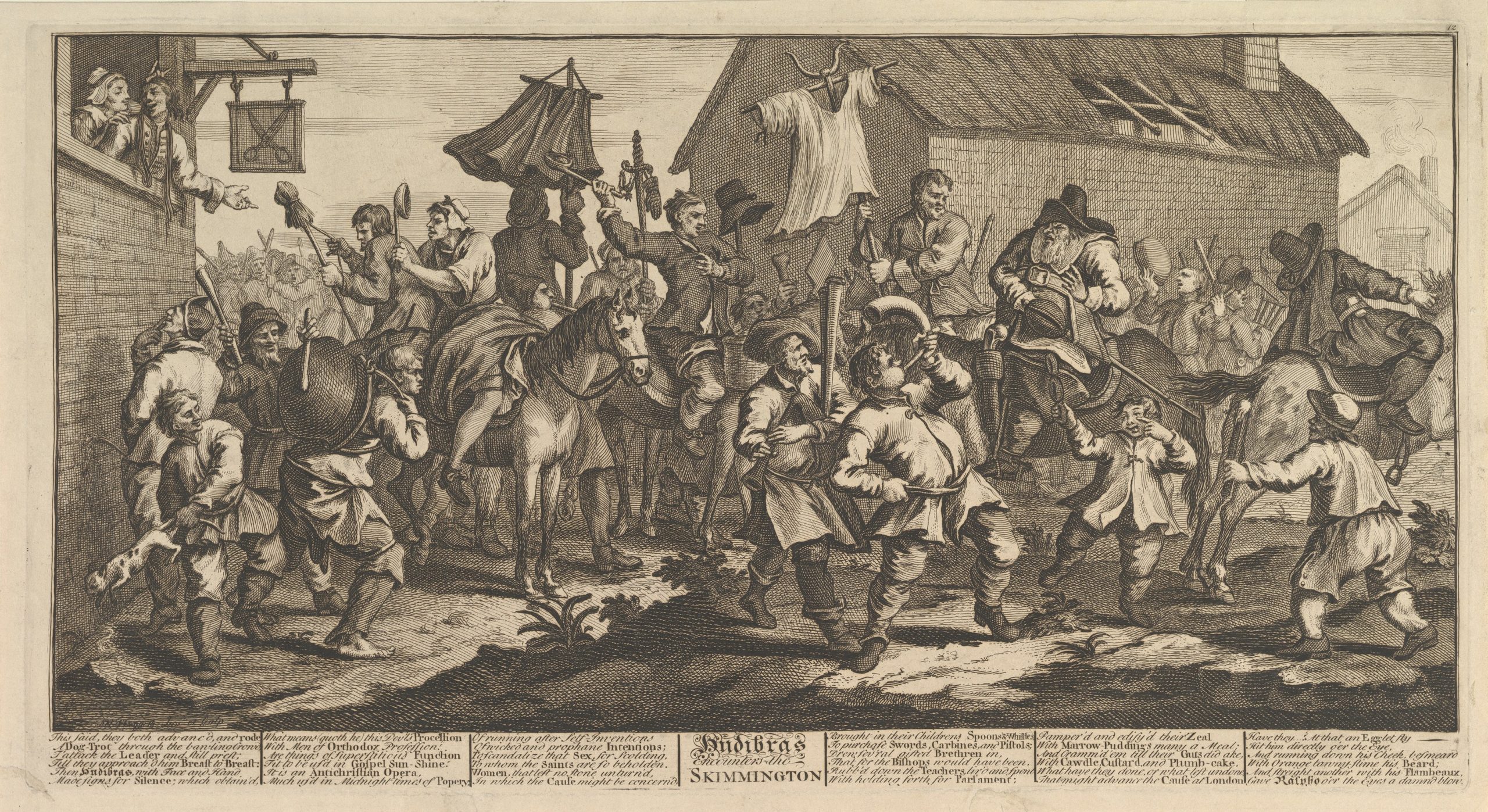 In this 1726 depiction of a skimmington by William Hogarth, a shrewish wife and her cuckold husband (mounted at left) are the objects of ridicule. She threatens him with a skimming ladle and rides sitting forward. He rides backward and holds a distaff, a symbol of women’s work. Villagers make rough music — one swings a cat by its tail to make it howl — and carry makeshift banners, one topped by horns, symbolizing a husband whose wife’s adultery has “put the horns on him.” A tailor laughs as the procession passes his shop, oblivious to his wife making the horns over his head, indicating that she is unfaithful to him — probably with the man watching from below who shows his contempt for the tailor by urinating on the shop wall. Metropolitan Museum of Art