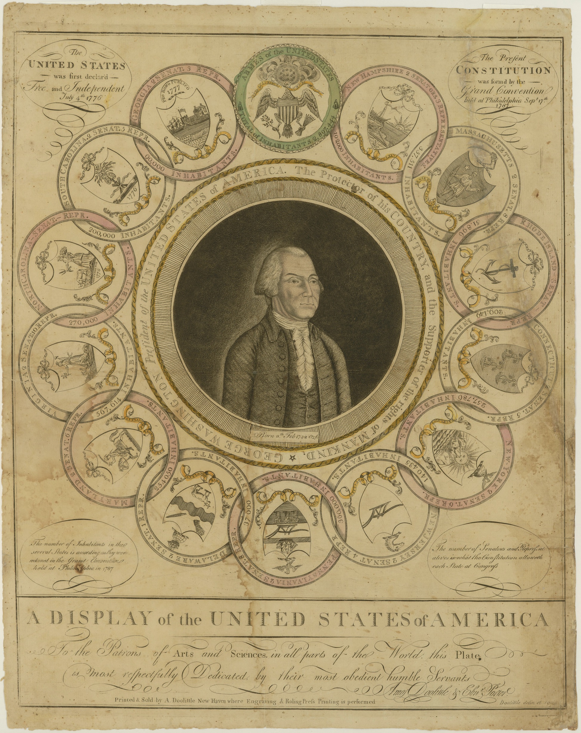 In A Display of the United States of America, published shortly after Washington’s inauguration, Amos Doolittle imitated monarchical traditions by describing Washington as “The Protector of his Country, and the supporter of the rights of Mankind” but portrayed the new president in a simple black suit, in sharp contrast to the ermine and silk worn by kings. John Carter Brown Library