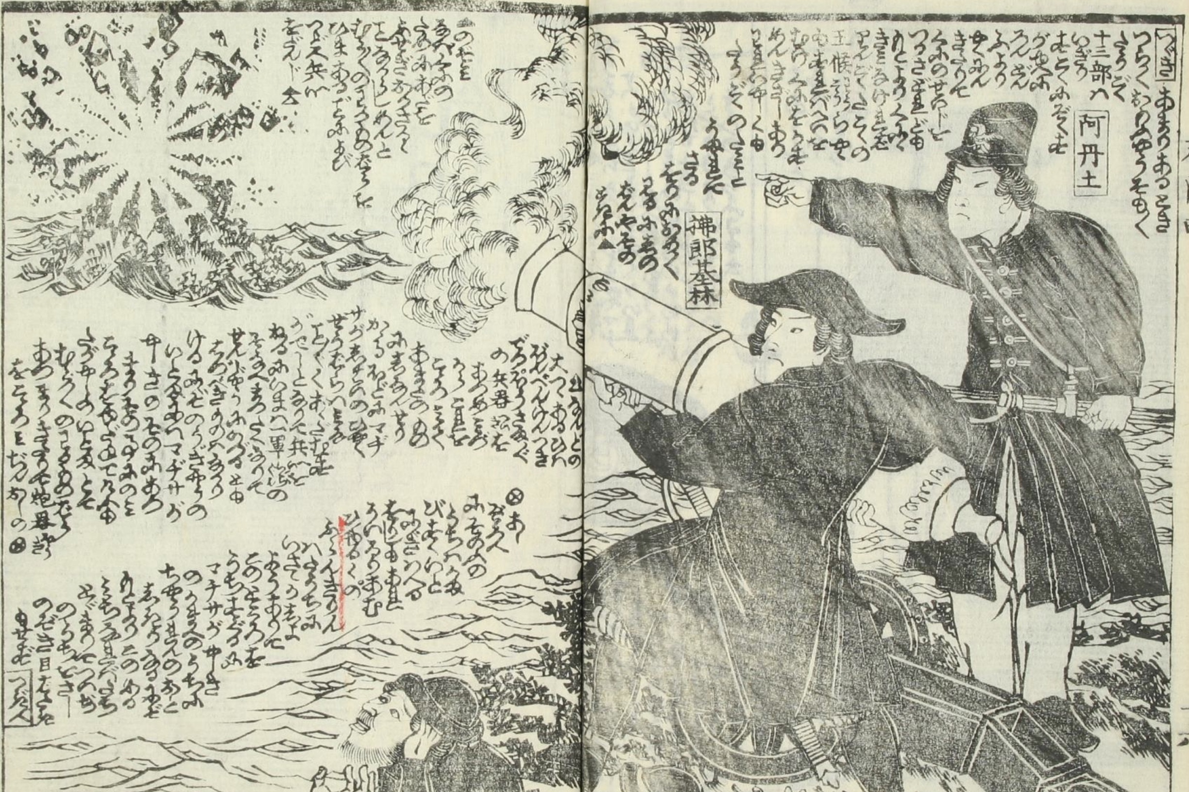 Fantasy filled the gaps in information in early Japanese accounts of the American Revolutionary War. Here in Kenagaki Robun’s Osanaetoki Bankokubanashi (1861) John Adams directs the fire of Benjamin Franklin, who holds a cannon barrel in his arms. Waseda University