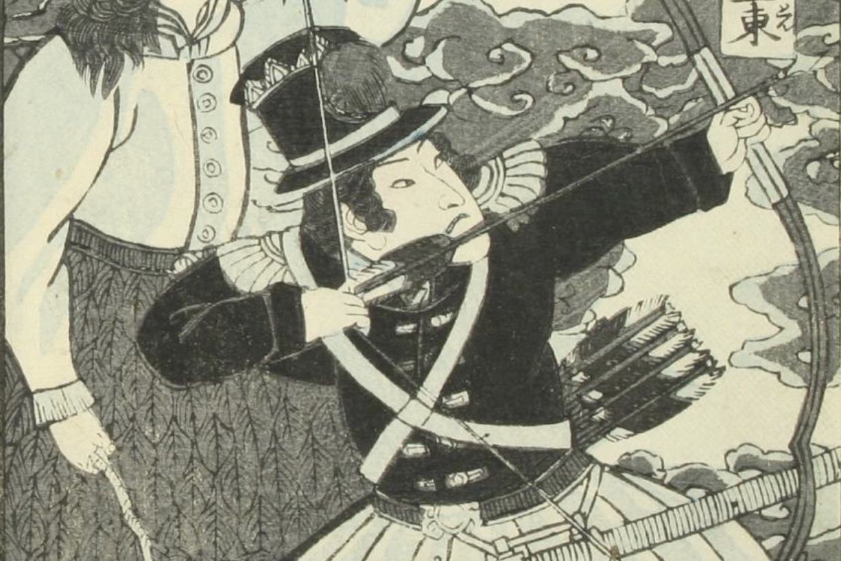 Above: In this woodblock print from Kenagaki Robun’s Osanaetoki Bankokubanashi (1861), a Japanese artist depicted George Washington as an archer firing on the British. Waseda University